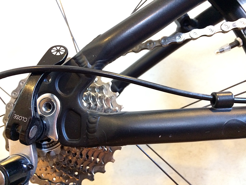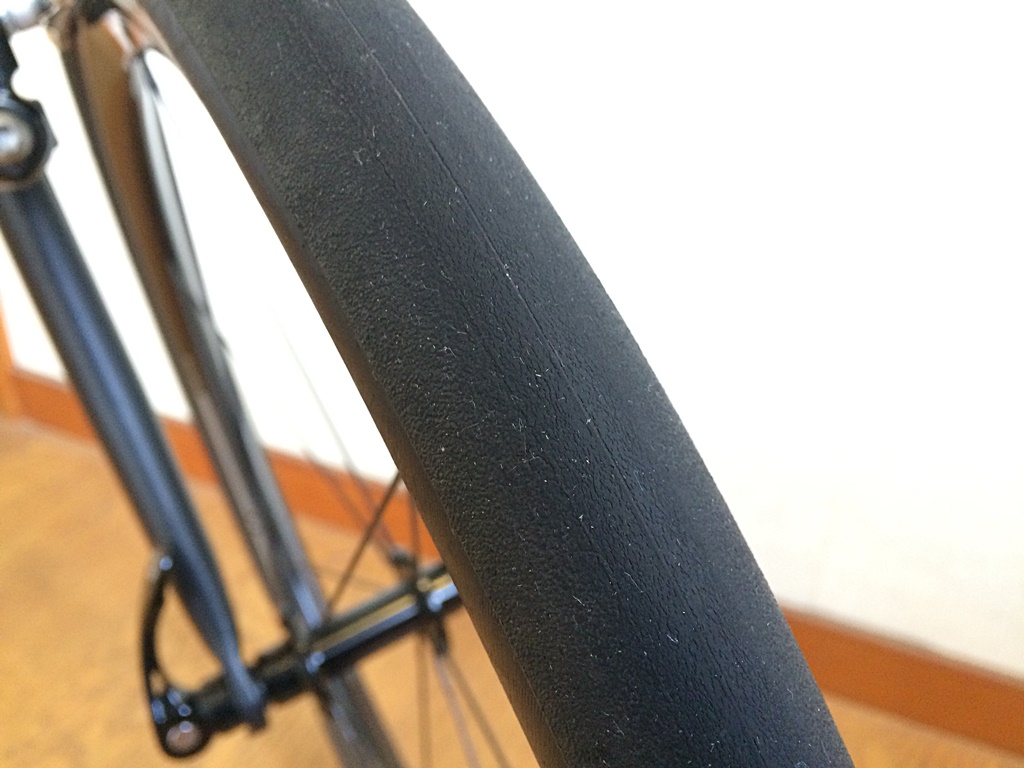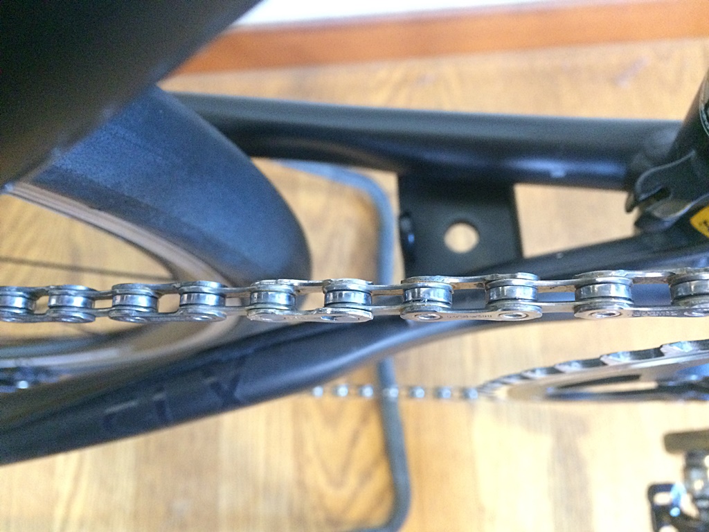 このパーツ、Ternのほうがよくできています。Ternのは筒の中をチェーンが通る構造なので、フレーム側だけでなくクランク側に落ちるのも防いでくれます。