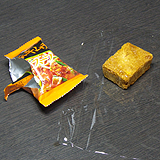 この手のインスタントは一見便利ですが、麺&かやくがセットで分離しにくく、麺5食分で一包み、かやく5回分で一包みという風に切り替えることができません。