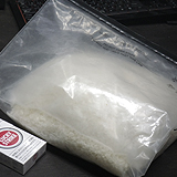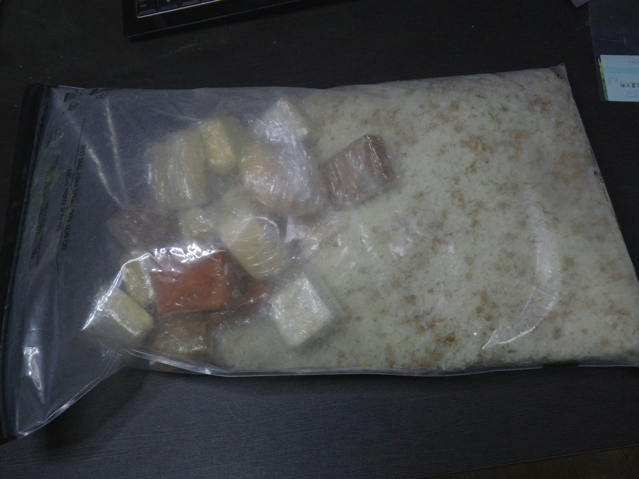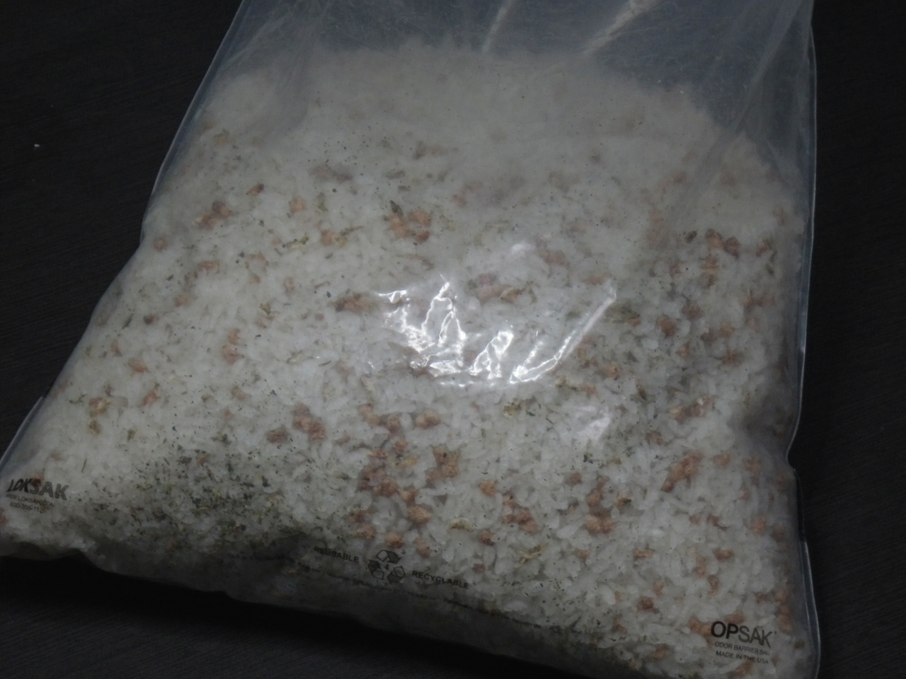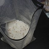 C〜D:アルファ化米も開封して、脱酸素剤を除いた米だけを大きなチャック袋にまとめます。