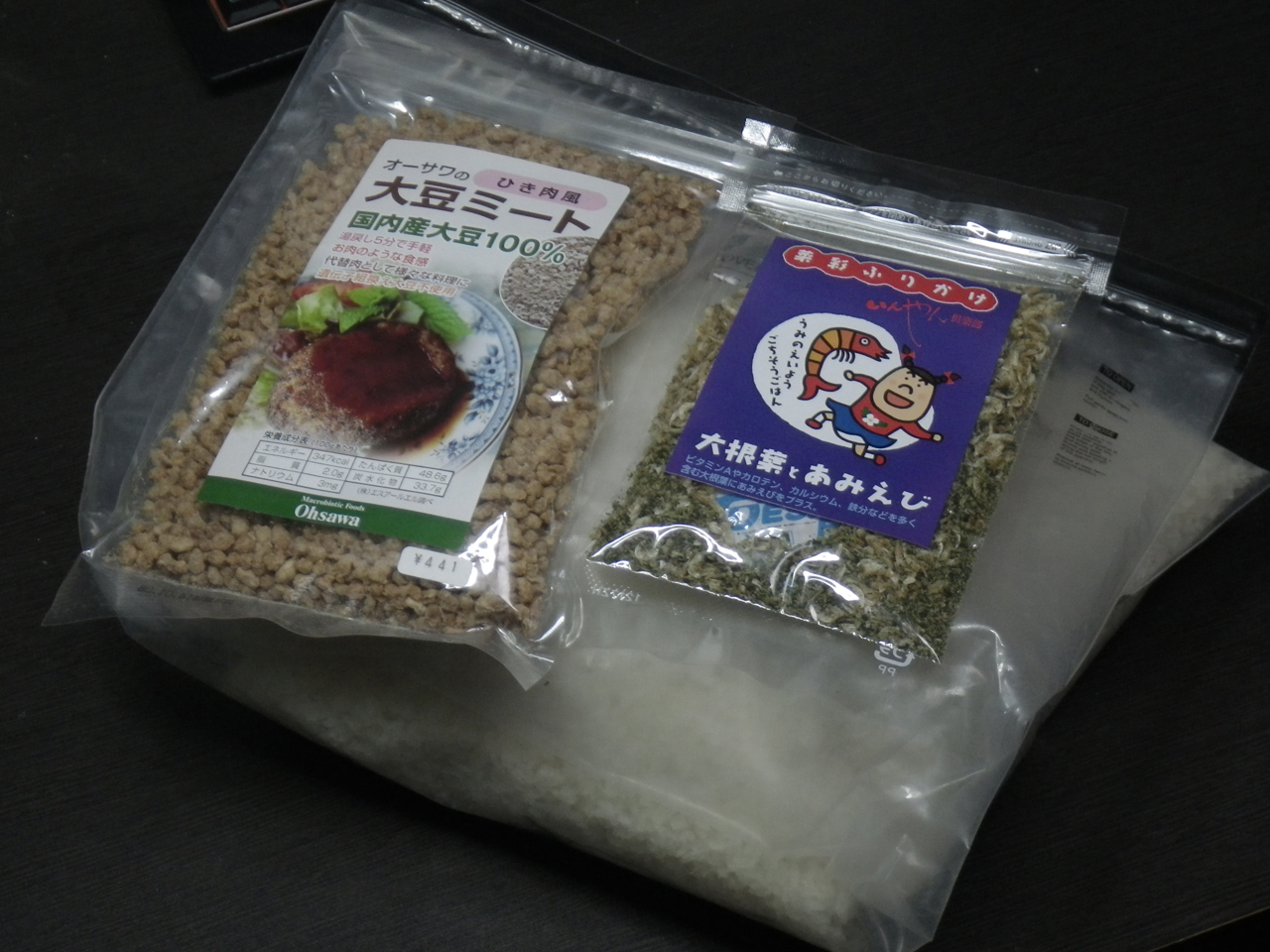 追加する具材分のパッケージを省けます。管理者おすすめは「大豆ミート」です。比重がアルファ米と同等なためか、偏らずに混ざります。今のところ、これだけで十分です。